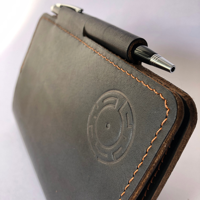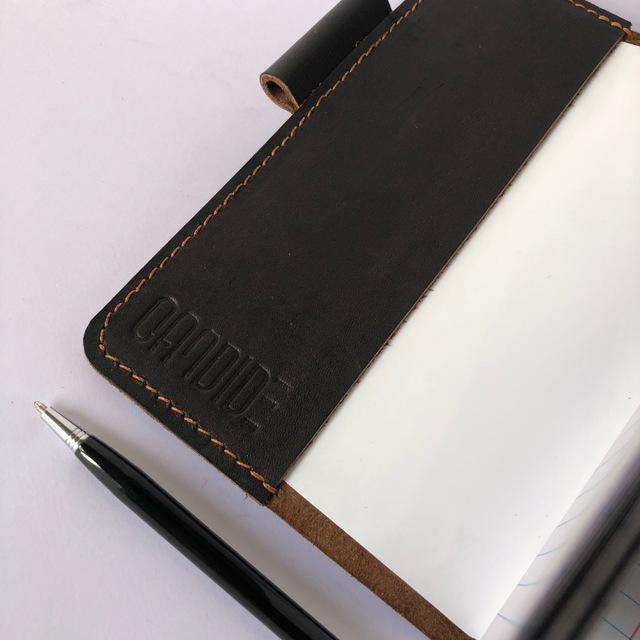 Couverture en cuir pleine fleur teinté noir. Cousue à la main, au point sellier.